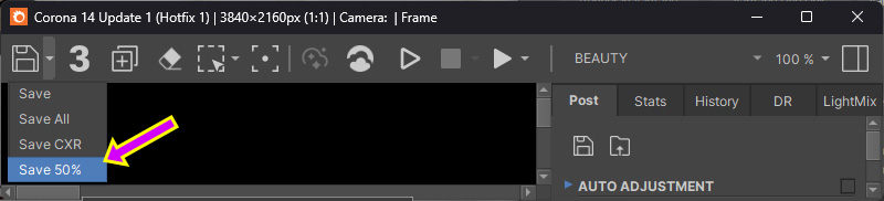 Corona 14 から Corona VFB のSaveボタンに「Save 50%」機能が追加されています。この機能経由で保存するとレンダリングが50%に縮小されて保存されます。ダウンサンプリングのアルゴリズムは単純なバイリニア補間が使われます。