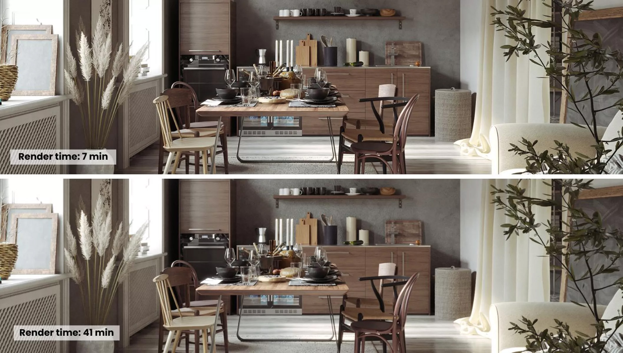 Chaosのテストでは 41分かかっていたレンダリングが、ほぼ同じ品質で7分に短縮されました。