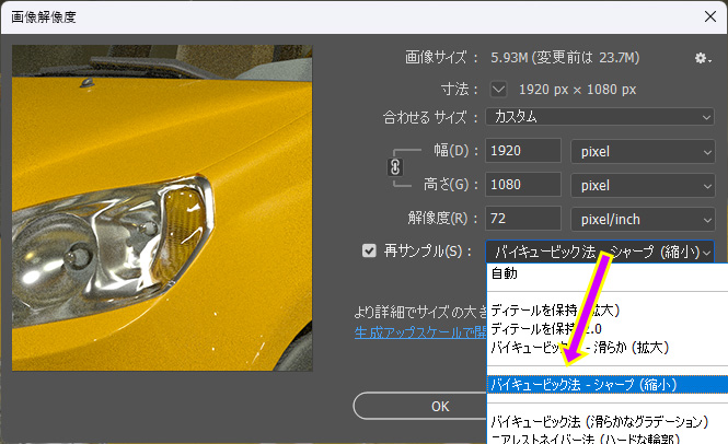 保存した2倍サイズの 8bit画像をPhotoShopに読み込み、イメージ>画像解像度.. を開き、解像度を半分にセットし、再サンプルアルゴリズムで「バイキュービック法 – シャープ(縮小)」を選択します。