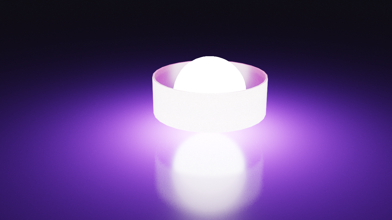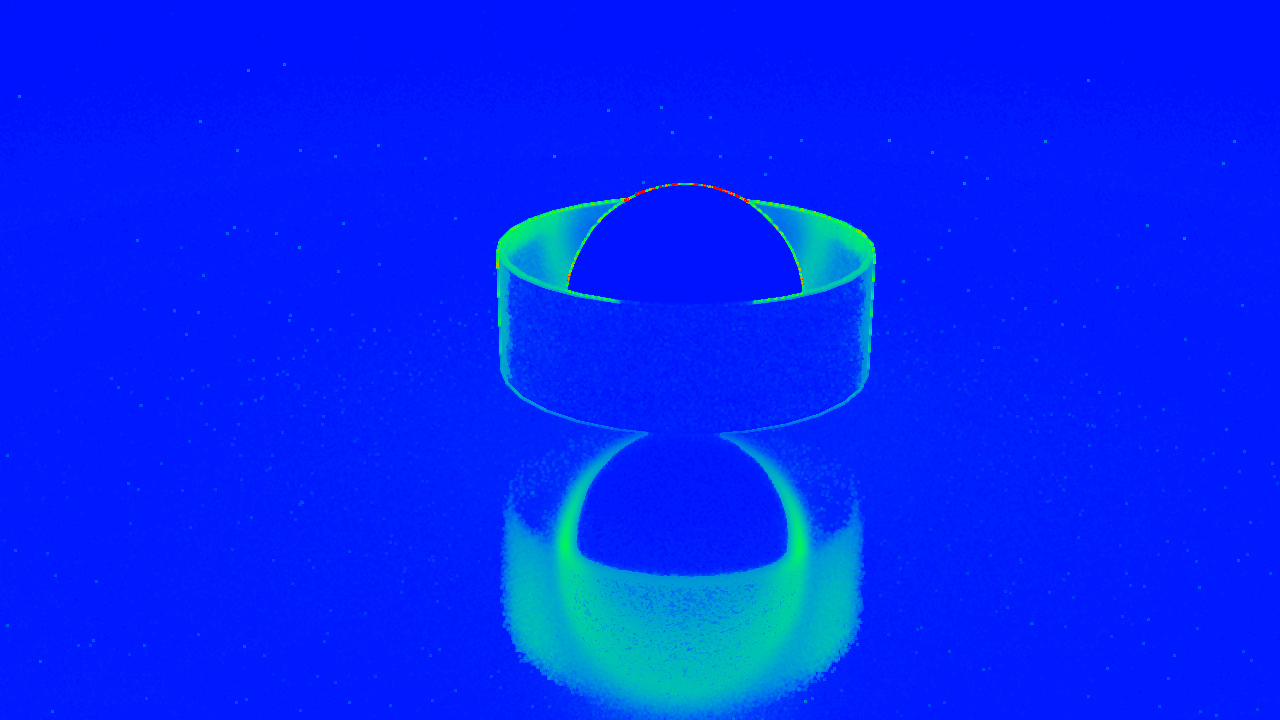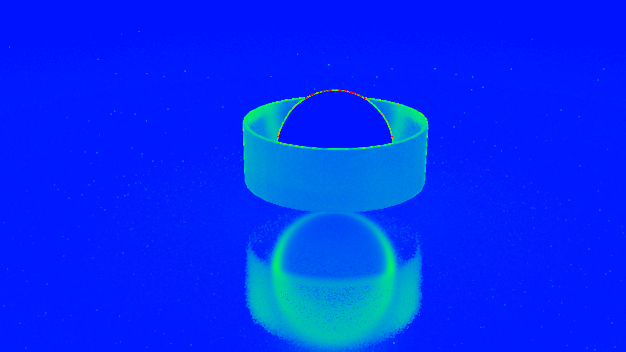 ここに、光沢(glossy)のある屈折チューブをスフィリカルライトに巻き付けた簡単なテストシーンがあります。以前の設定(adaptivity clamp ~100ほど)では、V-Rayは光沢面に多くのサンプルを費やしていますが、これらのサンプルは実際には最終的なレンダリング画像にあまり寄与していません。新しいデフォルトのadaptivity clamp 1.5は、レンダリング結果を同じに保ちながら、これをより高速にレンダリングします。